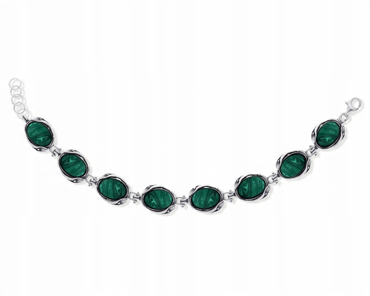Bransoletka srebrna z dużymi zielonymi malachitami Srebro 925