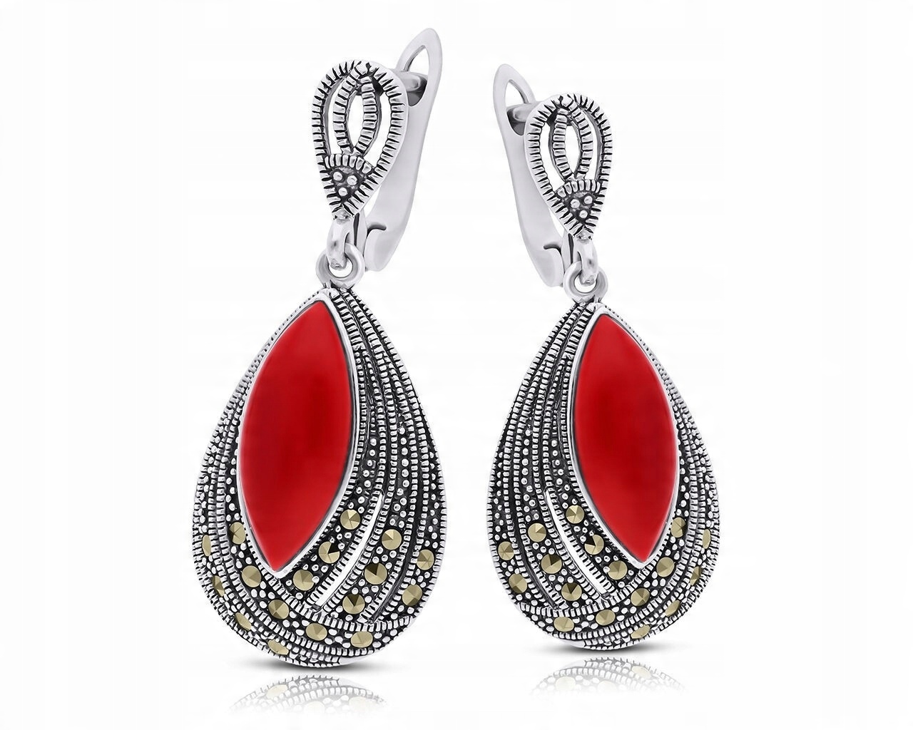 Kolczyki srebrne koral i naturalne markazyty Srebro 925