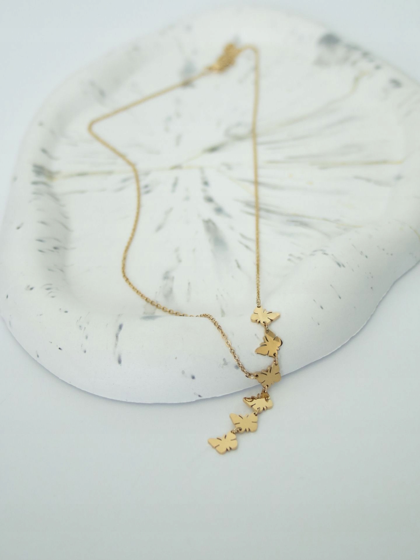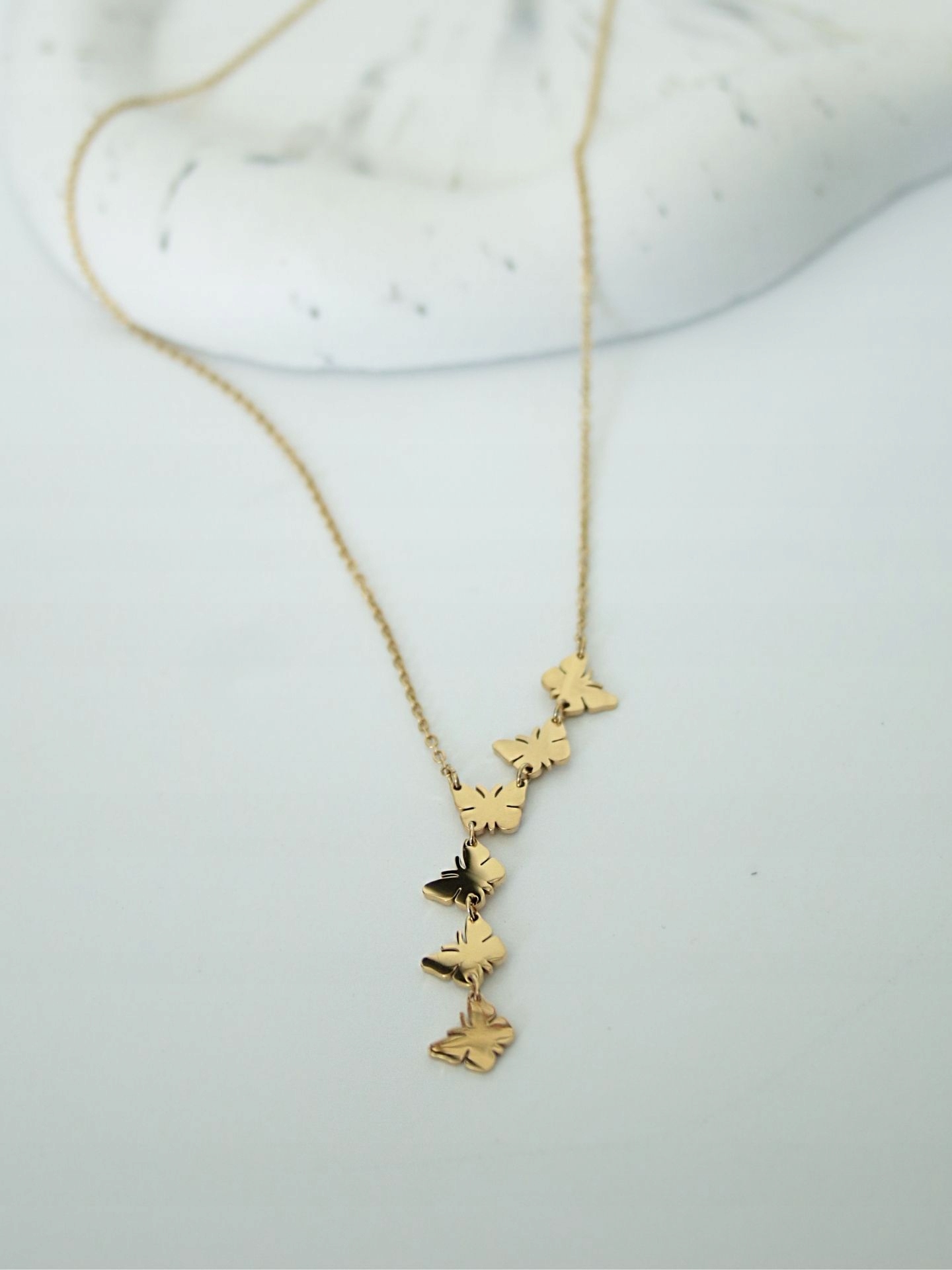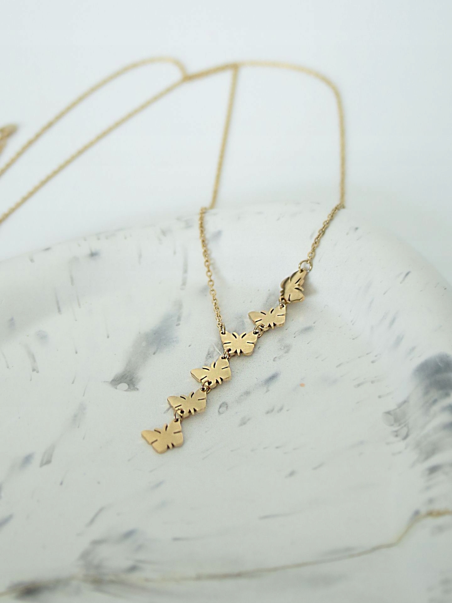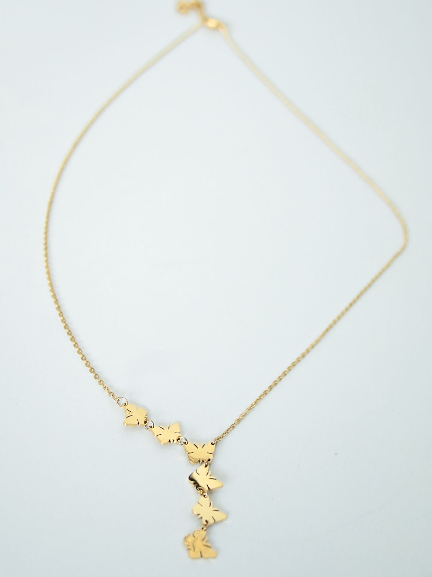 Elegancki, złoty łańcuszek z przywieszką w kształcie motylków.