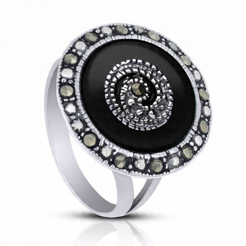 Pierścionek srebrny z czarnym onyksem i markazyty Srebro 925