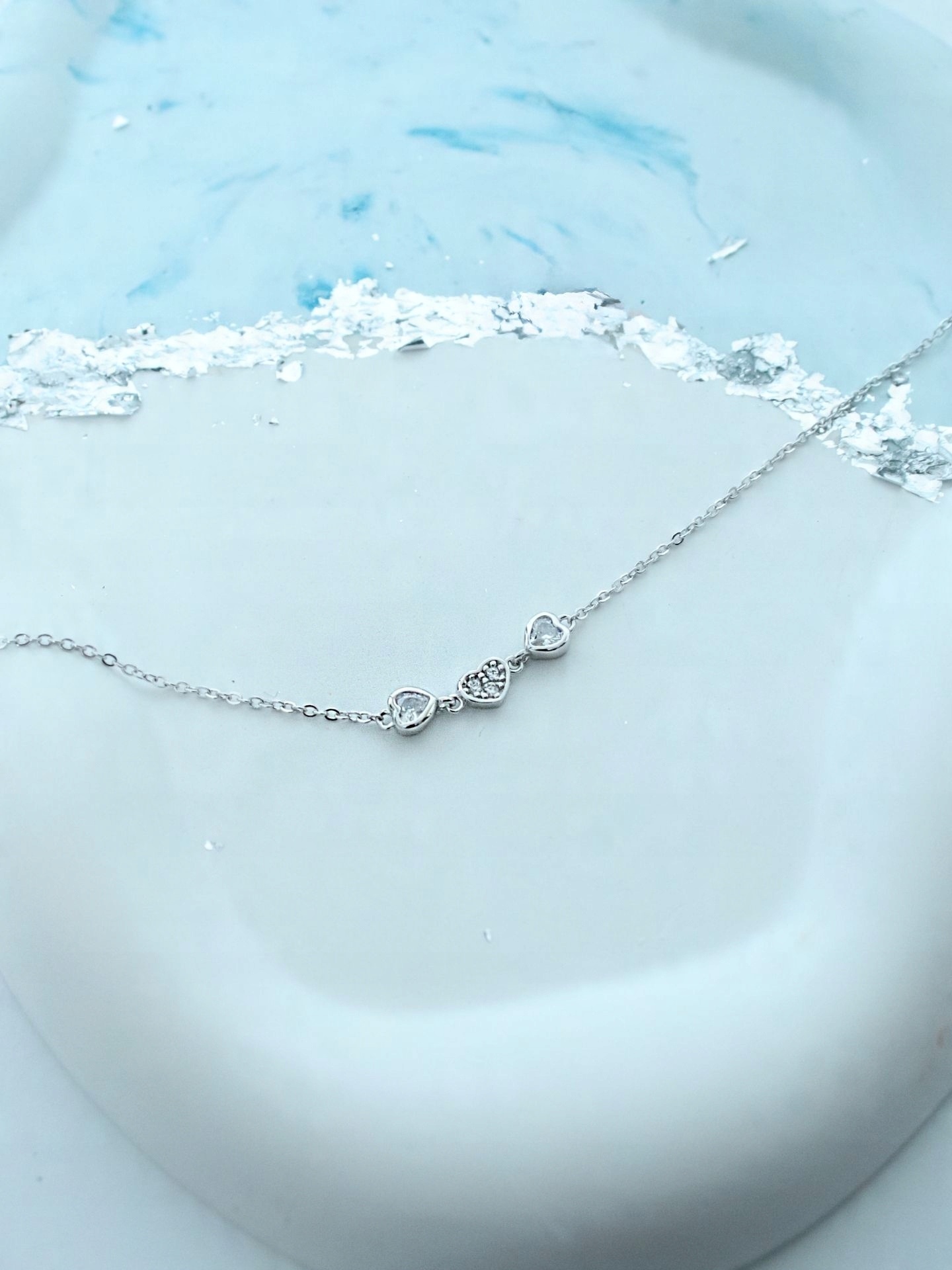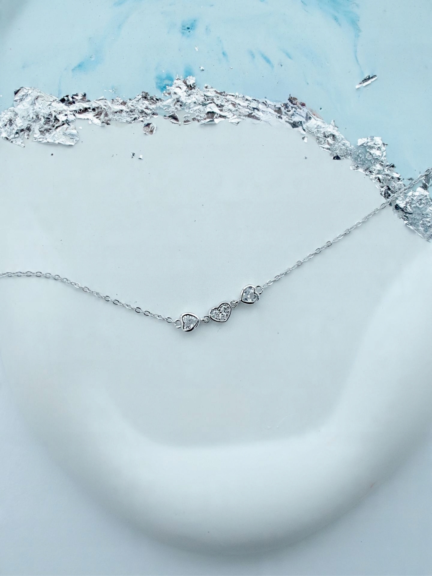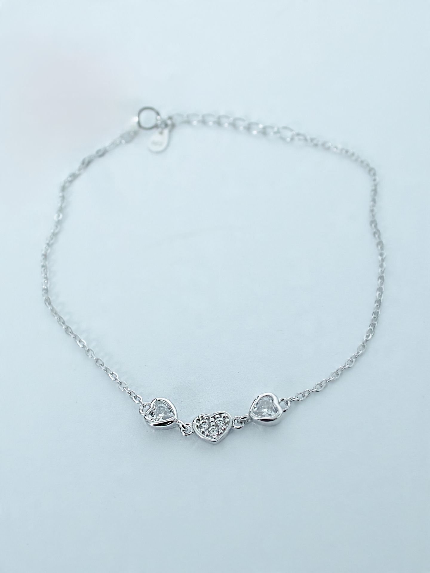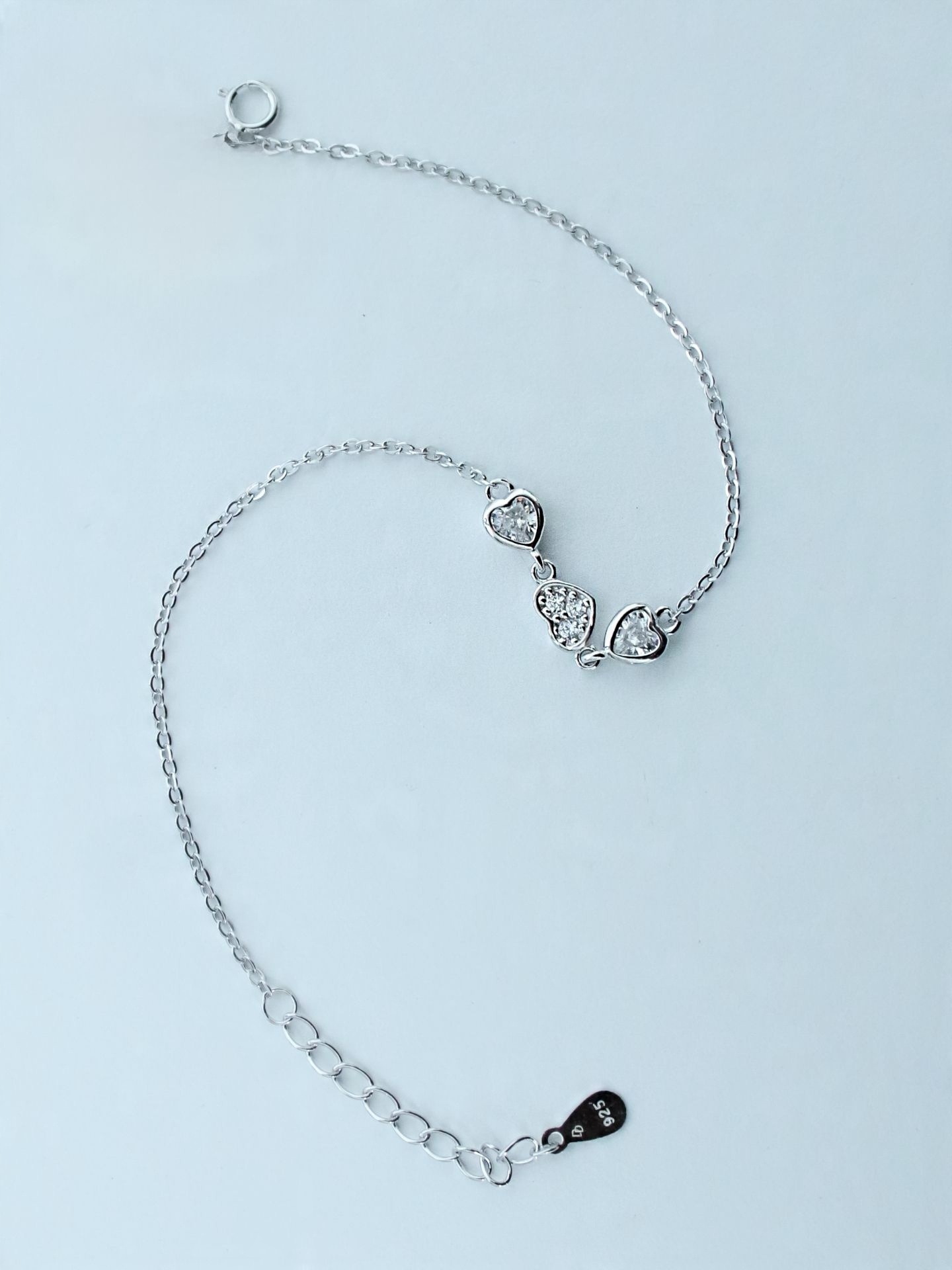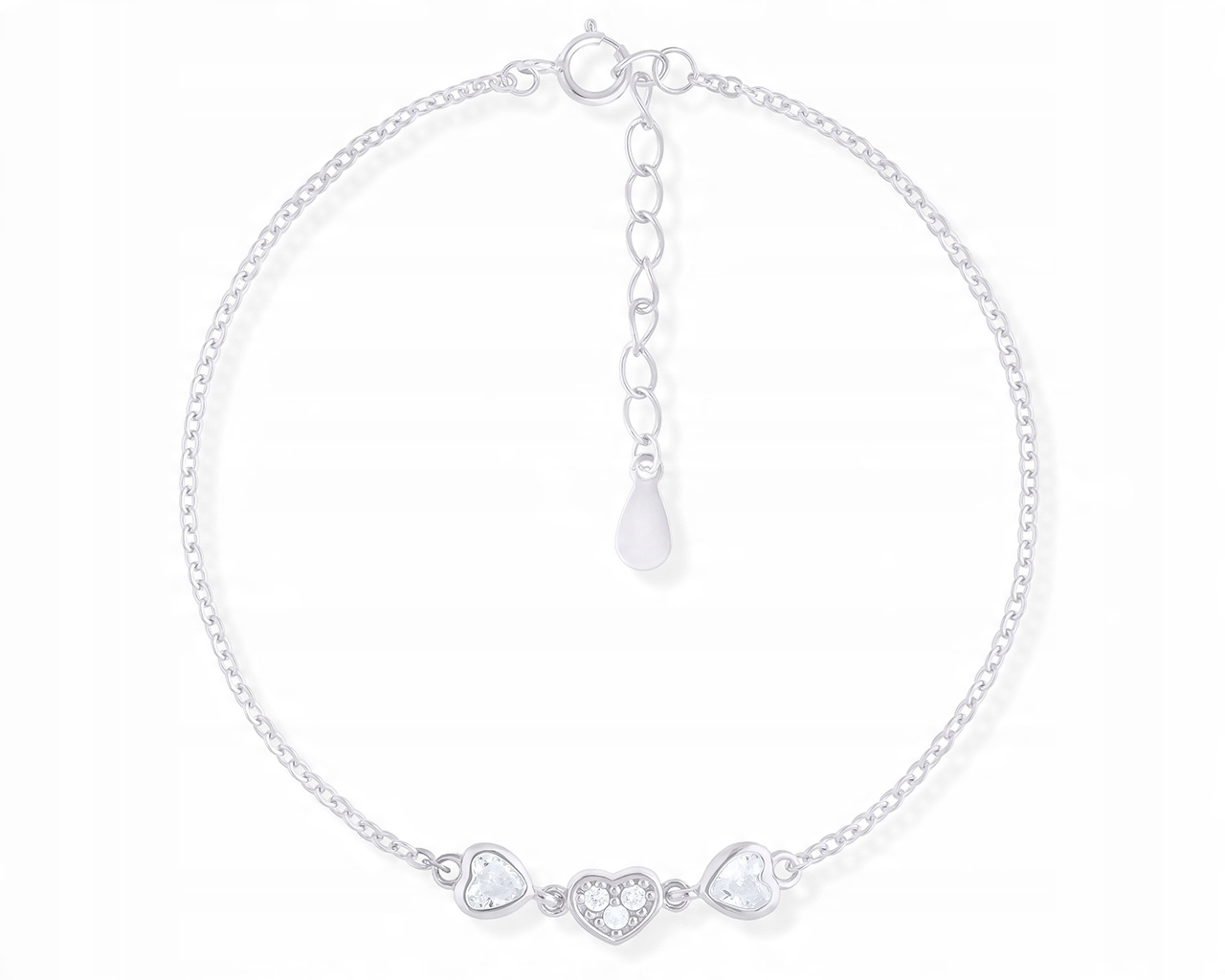 Srebrna bransoletka z trzema serduszkami z cyrkonią. Najwyższa jakość srebra o próbie 925.