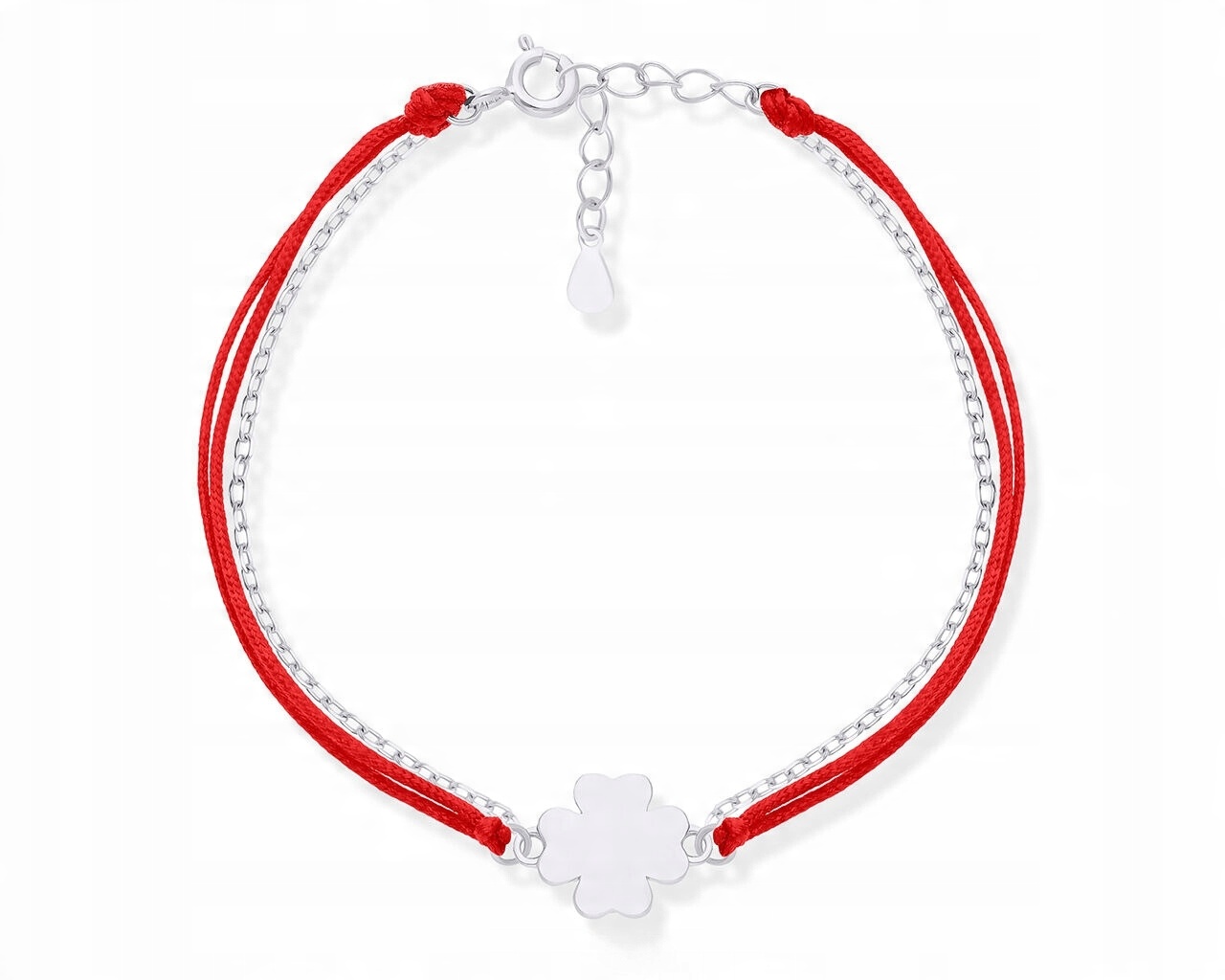 Bransoletka srebrna czerwony sznurek koniczynka, srebro o próbie 925.